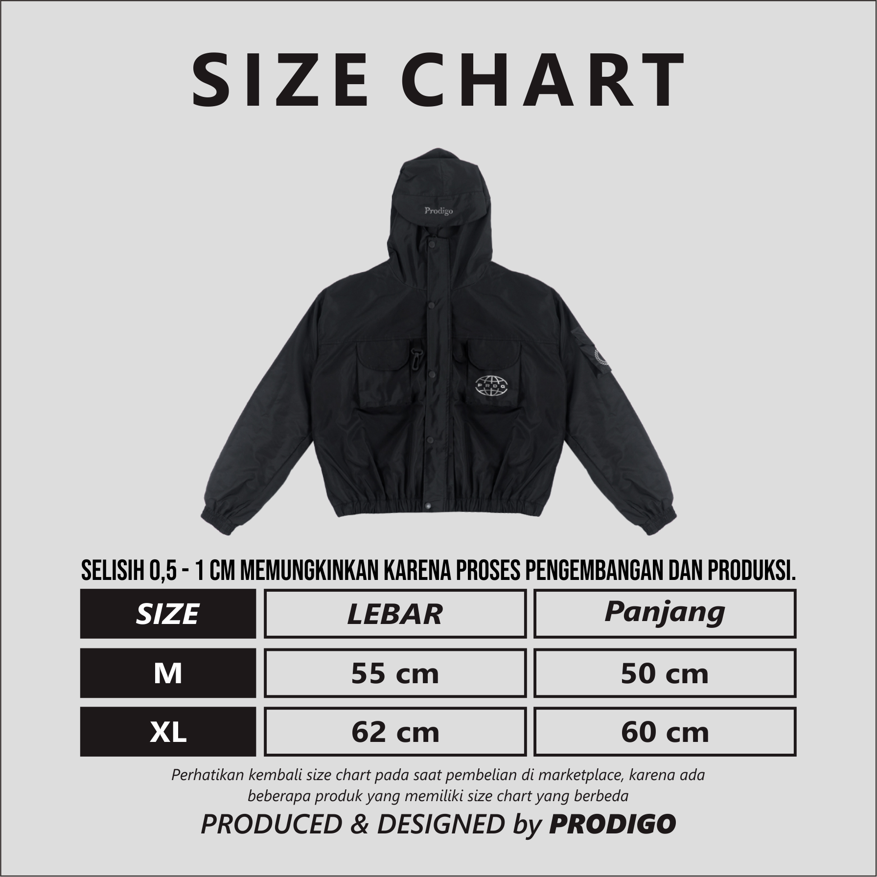 Note : Selisih 0,5 - 1 cm memungkinkan karena proses pengembangan produksi.
